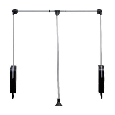 Składany drążek na ubrania o nośności do 10 kg. Wieszak można dostosować do szerokości szafy od 87 do 130 cm. Boczny element montażowy ma wymiary 30 x 10 cm.