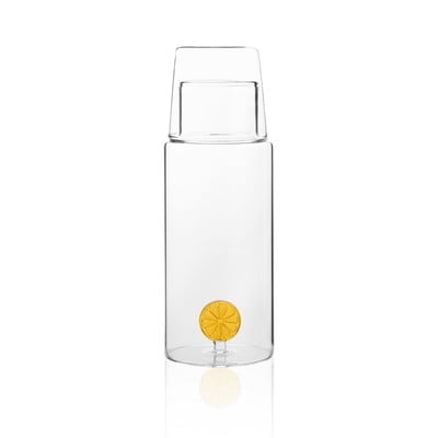 Jej minimalistyczny design uzupełnia praktyczny szklany kubek, który służy również jako pokrywka. Karafka ma ciekawy detal na dnie w postaci plasterka cytryny.