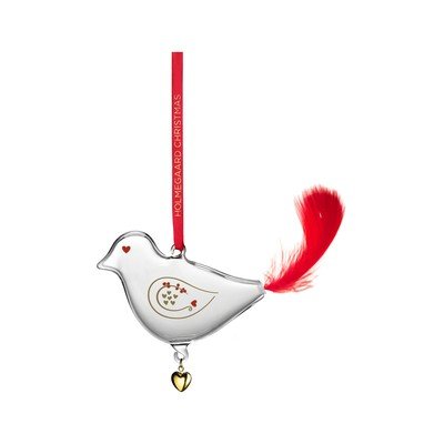Szklany ptak został wykonany z ręcznie dmuchanego szkła, co gwarantuje jego niepowtarzalność. Ozdobiony został czerwonym sercem w miejscu oka, złotymi sercami na ciele, prawdziwym czerwonym piórem jako ogonem i małą złotą zawieszką w kształcie serca zwisającą z dołu. W zestawie znajduje się również jedwabna wstążka, dzięki której można zawiesić ozdobę na choince, w oknie lub na gałązkach. Pięknie uzupełni pozostałe elementy z nostalgicznej kolekcji świątecznej. Ann-Sofi Romme tworzy swoją świąteczną kolekcję dla Holmegaard od 1993 roku, a każda z nich niesie ze sobą oryginalną świąteczną historię, która w wielu budzi radość i wspomnienia romantycznych świątecznych chwil.
