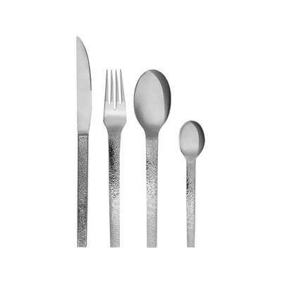 Rękojeść zdobi stylowa, teksturowana powierzchnia, która nadaje całemu zestawowi nowoczesny wygląd. Poszczególne sztućce mają wysokość 24, 21, 20 i 15 cm. Zestaw ten doskonale łączy w sobie ponadczasową elegancję z praktycznością.
