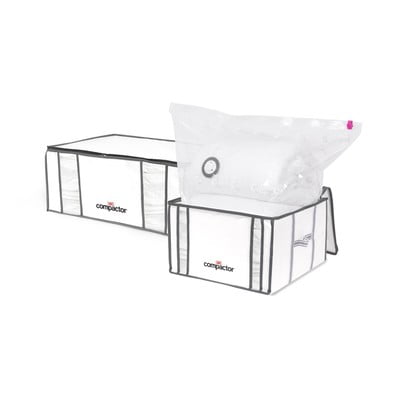 Nadmiar powietrza można wygodnie odessać za pomocą domowego odkurzacza. Dzięki zaworowi jednokierunkowemu nie trzeba się martwić o ponowne napompowanie worka po odessaniu powietrza. Posiada również przezroczyste okienka ułatwiające identyfikację zawartości i zintegrowane paski ściągające do przechowywania także w pozycji pionowej.