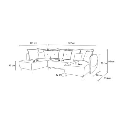 Rozkładany/ze schowkiemW kształcie litery UTurkusowyPowyżej 4 osóbSzerokość 322 cmGłębokość 191 cmGłębokość siedziska 58 cm