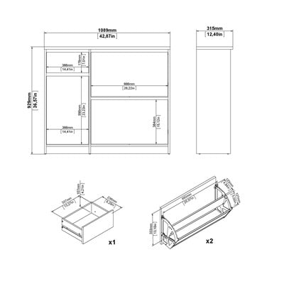 Posiada uchylne drzwiczki, zamkniętą szafkę z półką i szufladę, zapewniając miejsce na łącznie 12 par butów. Minimalistyczny wygląd z subtelną fakturą drewna nadaje meblowi nowoczesny i wyrafinowany charakter.