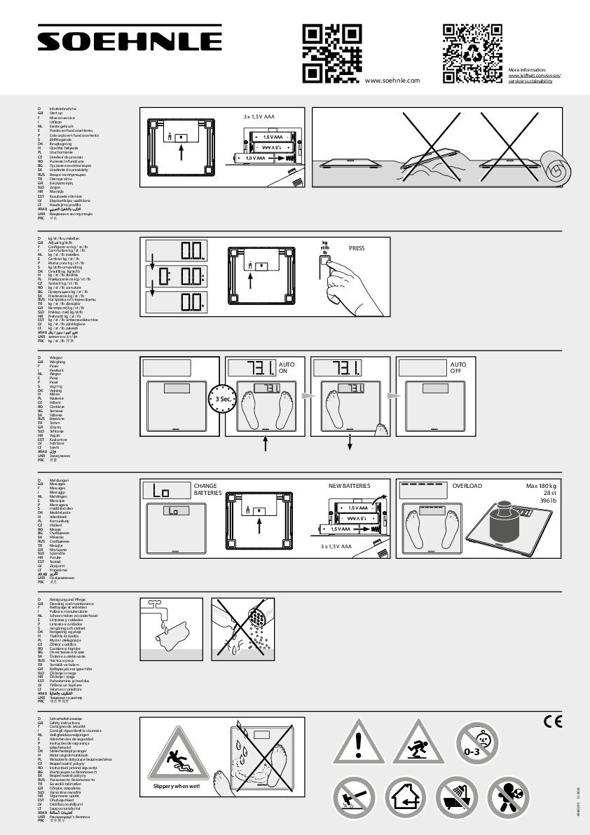 Waga łazienkowa Sense Safe 300 marki Soehnle to ultracienka waga cyfrowa z bardzo dużą, niebrudzącą powierzchnią ze stali nierdzewnej. Posiada duży wyświetlacz LCD z cyframi o wielkości 4,5 cm. Maksymalne obciążenie wynosi 180 kg przy dokładności ważenia 100 g. Waga automatycznie włącza się przy wejściu i wyłącza po ważeniu. Jest zasilana trzema bateriami AAA, które są dołączone i zabezpieczone śrubą.
