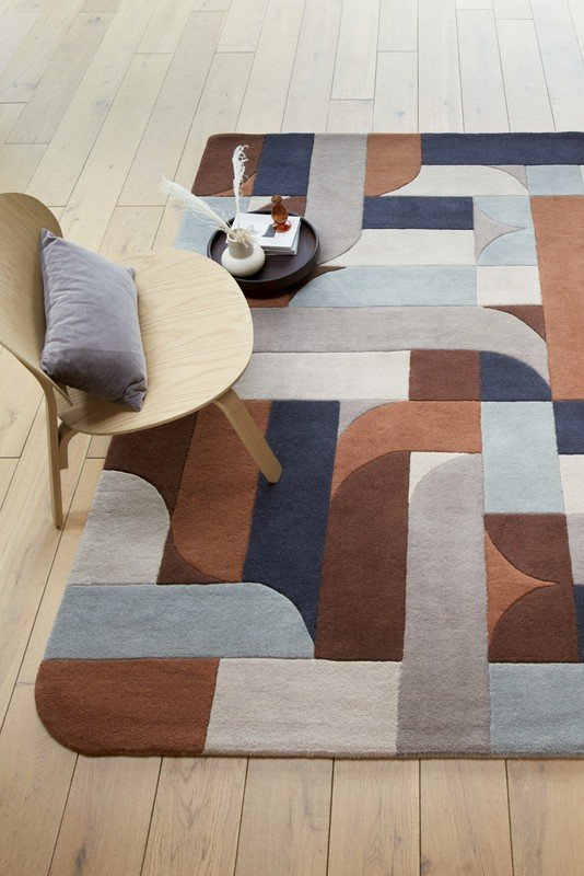 Wełniany dywan ze słynnej serii Matrix charakteryzuje się odważnymi geometrycznymi wzorami i neutralną paletą kolorów. Jest wykończony ręcznie przy użyciu technik, które podkreślają jego teksturę i skomplikowane detale.