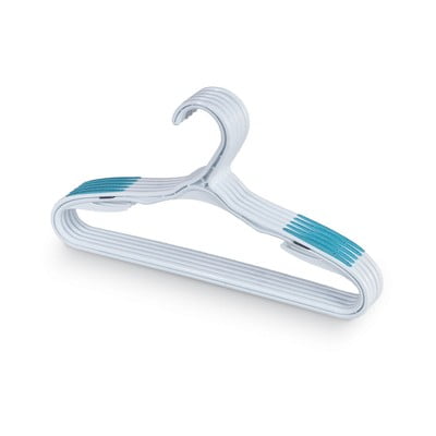 Mocne wieszaki z twardego plastiku z karbowanymi końcami zapobiegającymi zsuwaniu się ubrań