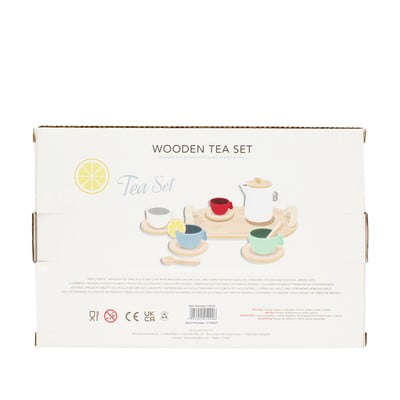 Zestaw wykonany jest z wysokiej jakości materiałów, które zapewniają doskonały wygląd i trwałość nawet przy wielu godzinach zabawy. W zestawie znajduje się drewniana taca, cztery silikonowe filiżanki z drewnianymi spodkami, silikonowy czajniczek z drewnianą pokrywką, dwie drewniane łyżeczki i drewniany plasterek cytryny.
