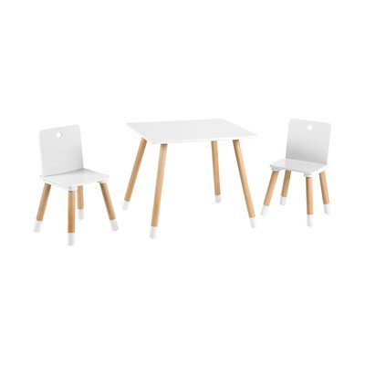 Zestaw mebli dla dzieci obejmuje stolik i dwa krzesła, które zostały zaprojektowane z myślą o wygodnym i bezpiecznym siedzeniu. Jego kompaktowy rozmiar sprawia, że idealnie nadaje się do pokoju dziecięcego lub bawialni. Krzesła mają wysokość siedziska 28 cm i wymiary całkowite 54 × 26,5 × 26,5 cm. Wymiary stolika to 49 × 60 × 50 cm.