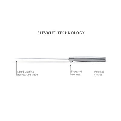 Noże mają ergonomicznie ukształtowane rękojeści z podpórkami Elevate, aby zapewnić wygodne i bezpieczne użytkowanie. W zestawie znajduje się również poręczny bambusowy organizer do szuflady, dzięki któremu noże są uporządkowane i bezpiecznie przechowywane.