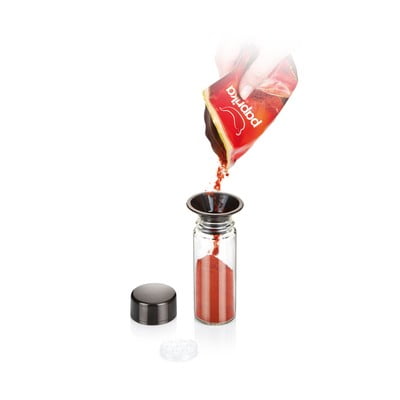 Season marki Tescoma składa się z ośmiu uniwersalnych słoiczków na przyprawy z 16 pokrywkami na zmielone i całe przyprawy oraz praktycznego obrotowego stojaka. Zawiera również lejek do wygodnego napełniania.