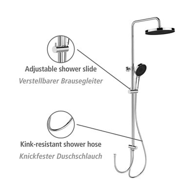 Zestaw prysznicowy Wenko składa się z deszczownicy (Ø 26) i słuchawki prysznicowej (Ø 13 cm), które można łatwo przełączać za pomocą mosiężnego przycisku.