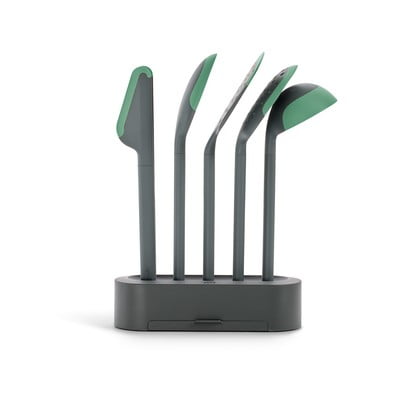 Zestaw przyborów kuchennych marki Lékué zawiera 5 niezbędnych elementów, które doceni każdy kucharz. Zestaw zawiera łyżkę do serwowania, łopatkę, szumówkę, szczypce i chochlę. Zawiera również poręczny stojak, dzięki któremu przybory kuchenne są zawsze pod ręką.