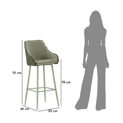 Design hokerów zachwyca tapicerką z charakterystycznym prążkowanym wzorem na zewnętrznej stronie oparcia i podłokietników, który dodaje tekstury i stylu. Dla wygodnego podparcia nóg, każde krzesło wyposażone jest w praktyczny podnóżek o wysokości 29 cm. Solidna metalowa konstrukcja nóg dopełnia całości.