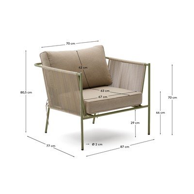 Za wygodę odpowiadają miękkie poduszki z wodoodpornej tkaniny, których pokrowce można łatwo zdjąć. Boki i oparcie fotela są ręcznie plecione z syntetycznego sznura odpornego na promieniowanie UV, co nadaje mu unikalny charakter. Pamiętaj, aby chować poduszki w deszczowe dni, by cieszyć się fotelem przez długi czas.