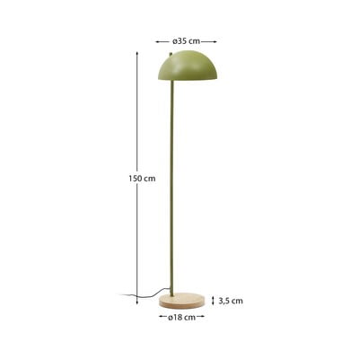 Lampa podłogowa Catlar marki Kave Home wykonana jest z metalu z zielonym wykończeniem. Lampa ma półokrągły klosz i stoi na prostej podstawie z drewna jesionowego. Jest kompatybilna z żarówką E27 o maksymalnej mocy 40 W. Żarówka nie jest dołączona do zestawu.