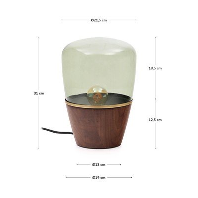 Lampa stołowa Silex marki Kave Home zachwyca połączeniem drewnianej podstawy z orzechowym fornirem i zielonego szklanego klosza. Lampa ma 30 cm wysokości i jest kompatybilna z żarówkami E27 o maksymalnej mocy 25 W. Żarówka nie jest dołączona do zestawu.