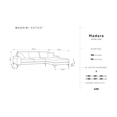 Mazzini Sofas Madara to aksamitny narożnik o delikatnym połysku. Obicie jest jedwabiste i miękkie w dotyku. Sofa posiada również bardzo dobrą odporność na ścieranie, co znacznie zmniejsza ryzyko uszkodzeń. W zestawie 2 poduszki ozdobne.