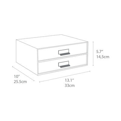 Wykonany jest z wytrzymałej tektury z recyklingu pokrytej papierem. Jest wyposażony w uchwyt na etykiety do łatwej i szybkiej identyfikacji zawartości oraz eleganckie skórzane uchwyty ułatwiające otwieranie szuflad. Gumowe nóżki na spodzie zapobiegają przesuwaniu się i zarysowaniom na meblach.